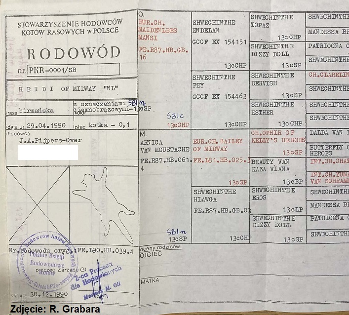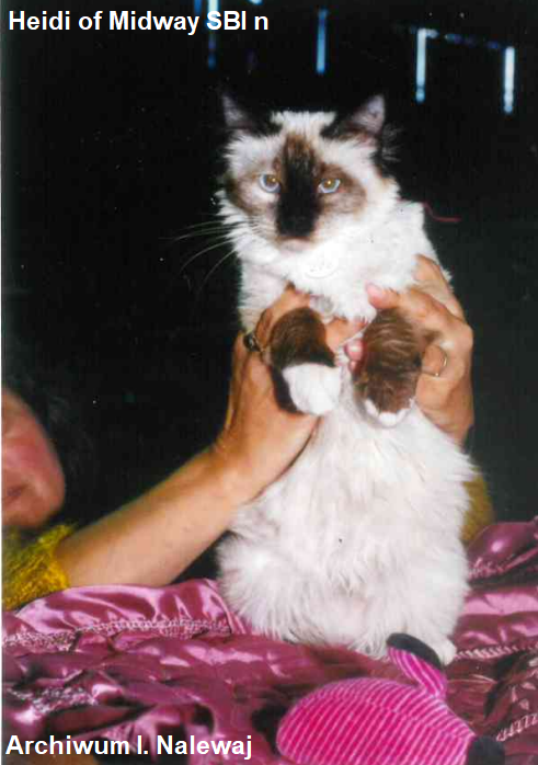 Heidi of Midway została wpisana do Polskiej Księgi Rodowodowej Stowarzyszenia Hodowców Kotów Rasowych w Polsce pod numerem jeden w rasie kotów birmańskich, natomiast Kazu z numerem dwa.