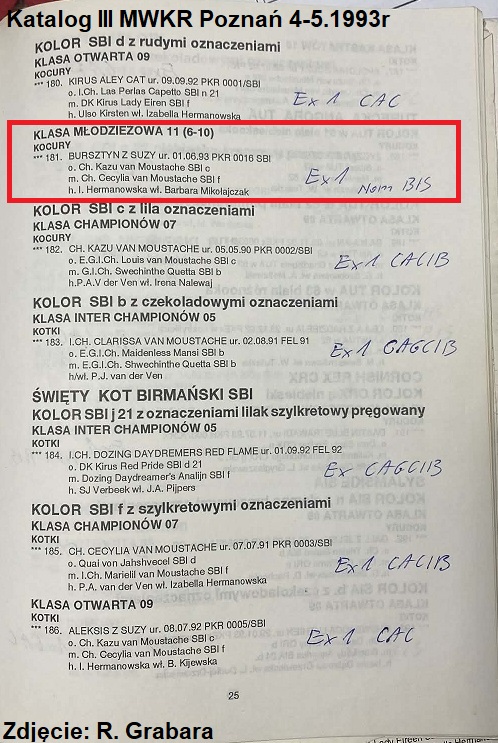 W roku 1993 na wystawie w Poznaniu odnotowano kilka znaczących debiutów. Zaistniała wówczas hodowla Teresy Kustosz, która wystawiała kotkę Saba Princess, urodzoną 5.07.1992 r. i zarejestrowaną w Polskiej Księdze Rodowodowej rasy pod numerem 9. Jej matką była Gandhie de Kikhoun (SBI a), natomiast ojcem znany nam Kazu van Moustache. Matka Saby musiała być najprawdopodobniej kotem importowanym.