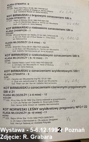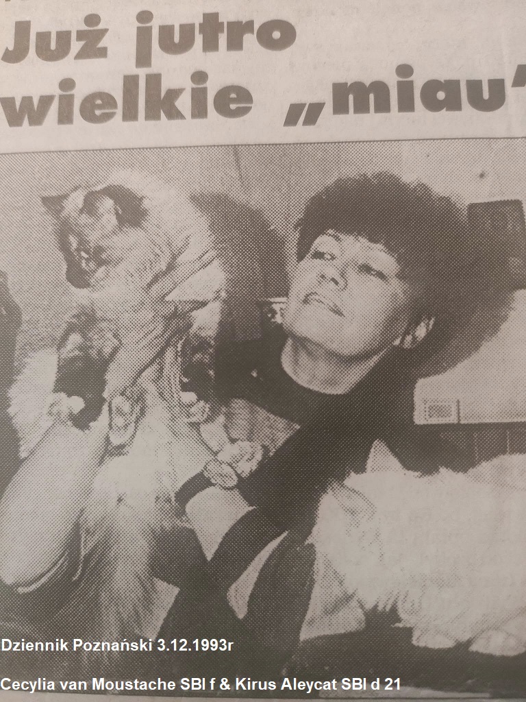 W grudniu tego samego roku na poznańskiej wystawie zadebiutował również świeży import z Danii – Kirus Aleycat (SBI d21), sprowadzony przez Izabellę Hermanowską. Na tej wystawie zaprezentowano łącznie sześć kotów birmańskich, w tym pięć wystawianych przez polskich hodowców. Wszystkie uzyskały lokatę pierwszą, a Heidi i Cecylia otrzymały certyfikaty na championa. Młodziutki duński import zakończył rywalizację z tytułem Best in Show.